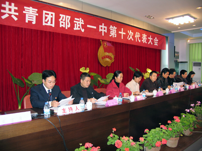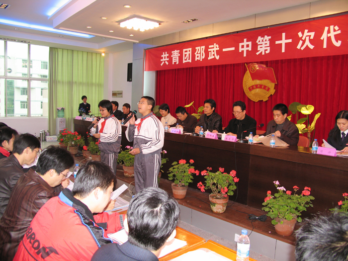 12月11日,共青团邵武一中第十次代表大会在校教工会议室隆重召开。会场上优雅的绿萝映衬着光彩夺目的团徽,漂亮的鲜花簇拥着庄严肃穆的主席台,整个会场气氛热烈庄严。学校43个团支部选举产生的135名代表参加了大会。邵武一中校长范纯善,党总支张光华书记以及学校各部门负责人出席了开幕式,共青团邵武市委书记危宜斌、共青团邵武市委副书记范晓蓉、市教育局党委书记吴建华、市教育局德育科科长叶青桦、兄弟学校团委负责人应邀出席了开幕式。