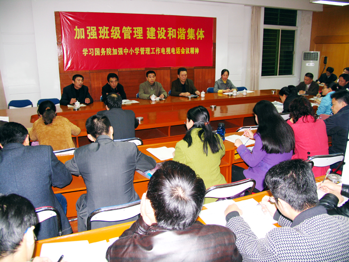 11月30日晚,我校在行政会议室召开主题为“学习国务院加强中小学管理工作电视电话会议精神,加强班级管理,建设和谐集体”的全校班主任工作会议,全校各班班主任参加了会议。