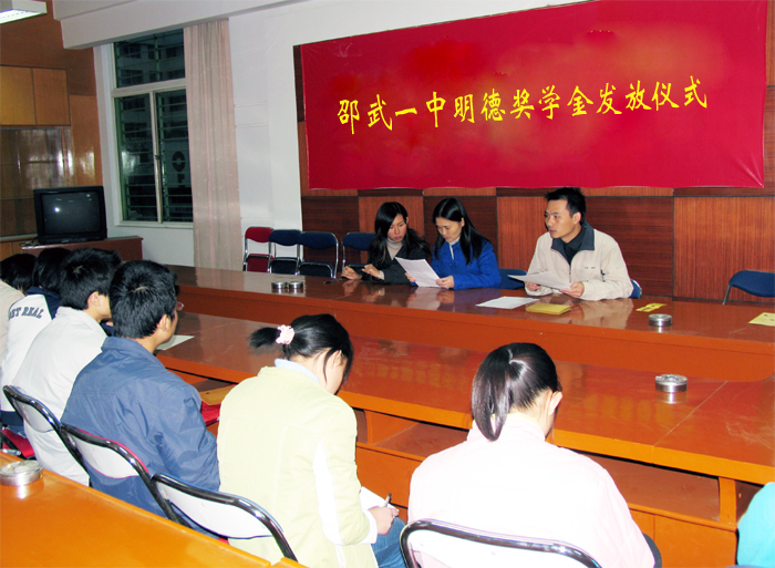 邵武一中9名同学喜获明德奖学金 12月9日,邵武一中团委在校行政会议室举办明德奖学金发放仪式,一中团委书记陈丹出席了颁奖仪式并为获奖学生颁奖。 明德奖学金由华阳电业有限公司创立,由中国青少年发展奖金会实施管理,资助对象主要是农村品学兼优且家庭贫困的小学至大学各阶段的学生,是单项救助项目中人数最多的希望工程项目。为了确保该项目的顺利实施,团市委专门制定《明德奖学金实施管理细则》,严格申报、填表、资格审核、资金发放等有关程序,负责监督、管理、实施,保证了该奖学金实施的公开、规范、透明。 此次明德奖学金发放仪式中,我校蔡国斌、官海平等9名品学兼优的贫困学生获得了每人每学期450元的奖学金资助。