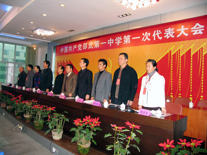 中国共产党邵武第一中学第一次代表大会于12月23日上午在校教工会议室隆重开幕。大会主席台前,花团锦簇,大会标语醒目地悬挂在主会场上方,主席台中央,十面鲜艳的红旗簇拥着党徽,在鲜花绿植的映衬下,显得庄重而热烈。