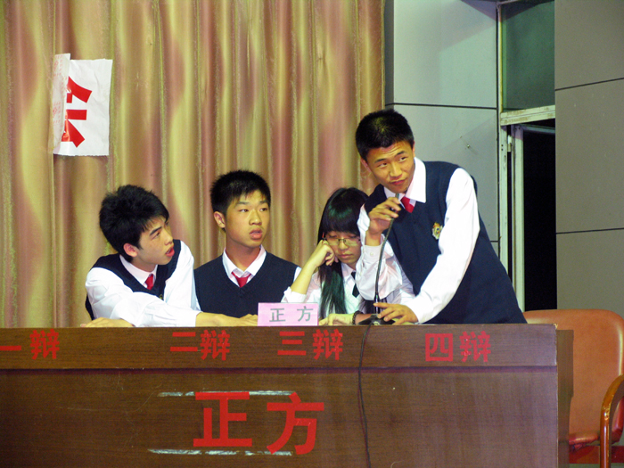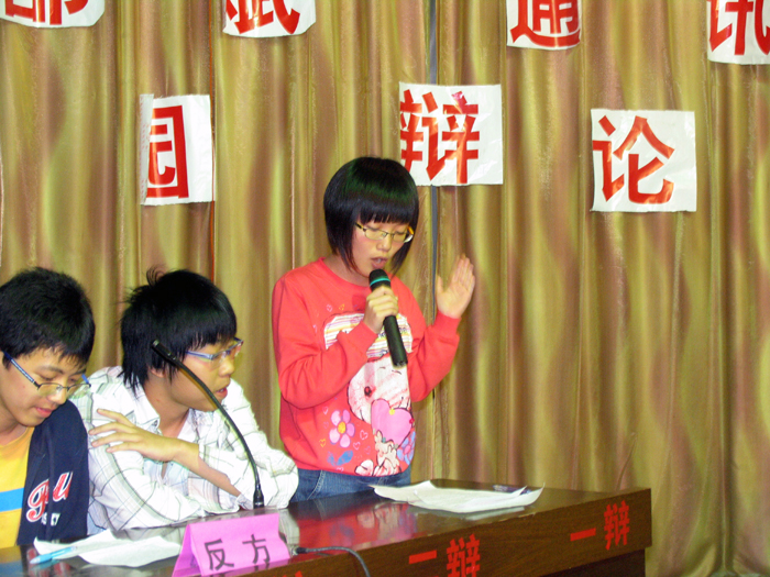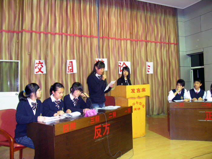 5月7日晚,一中团委、学生会在校学生报告厅举办首届邵斌通讯杯校园辩论赛,来自高一、高二年段的八支代表队参加比赛,经过激烈的唇枪舌剑,高二(3)班,高二(10)班,高二(11)班,高一(10)班取得了第一轮比赛的胜利。