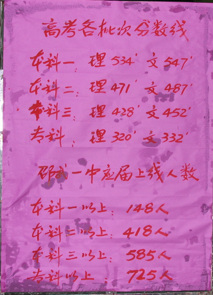 邵武一中2008年高考再创佳绩:本科线以上共706人,其中:应届本一上线148人、本二线以上418人、本三线以上585人;南平市理科总分前十名我校占四名,再创历史新高。