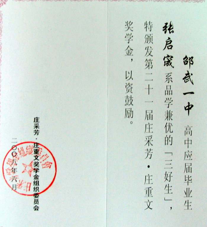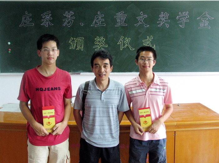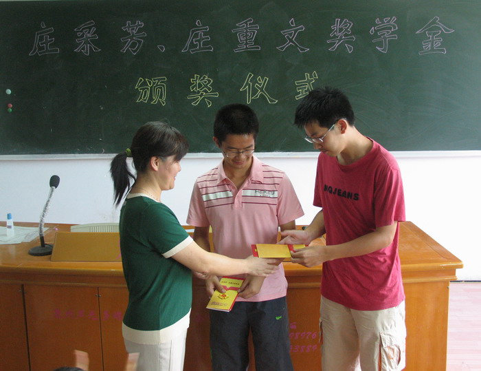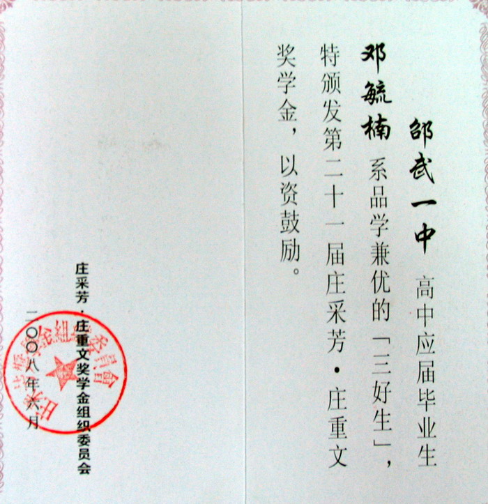 根据省教育厅《关于公布2008年“庄采芳•庄重文奖学金” 获奖学生名单的通知》(闽教基〔2008〕46号)文件通知,邵武一中邓毓楠、张启宬获得2008年“庄采芳•庄重文奖学金人民币1000元。