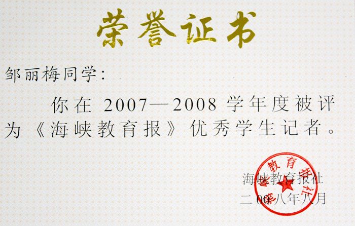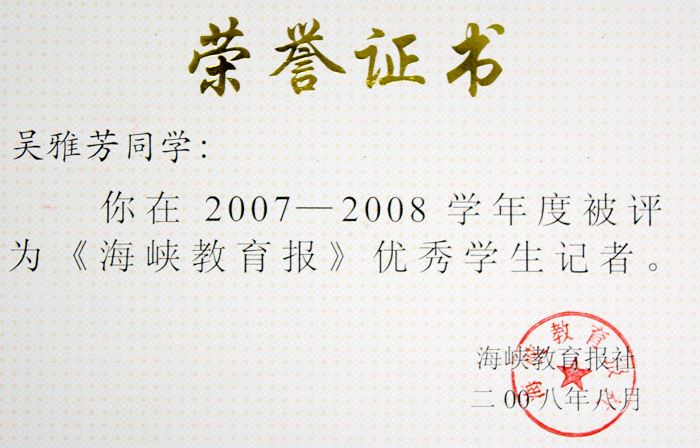 邵武一中学生记者站荣获2007-2008年度《海峡教育报社》优秀记者站