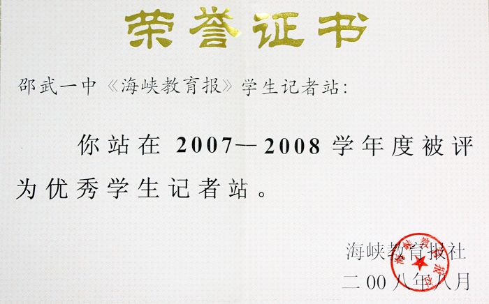 9月9日,邵武一中学生记者站被海峡教育报社授予2007-2008年度优秀记者站。邹丽梅、吴雅芳两位小记者被评为优秀学生记者。邵武一中学生记者站成立于2006年10月,小记者们以《海峡教育报社》、《邵武新闻》以及校团委自办团刊《青春号角》为平台积极宣传学校新人新事,撰写校园生活体验感悟,介绍学习经验、方法,对丰富校园文化起到了引领和推动作用,得到了学校领导和师生的充分肯定。