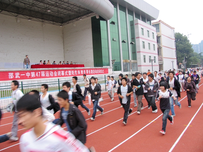 今天的闭幕式同时又是我校开展“阳光体育冬季长跑活动”启动仪式。启动仪式由校党委张光华书记主持,学校决定将在法定工作日,每天以班级为单位,将冬季长跑活动与体育课和课外体育活动有机结合,组织学生完成跑步里程,节假日和寒假期间也要求学生自觉坚持长跑并做好记录。仪式上,全校2000多名师生精神焕发,纷纷表示要坚持每天锻炼,达到“健康工作五十年,幸福生活一辈子“的活动目标。启动仪式后,全校各班绕运动场跑步一圈,更有班级打出“我运动,我快乐”的口号,体现了一中“阳光、健康、和谐“的运动精神。
