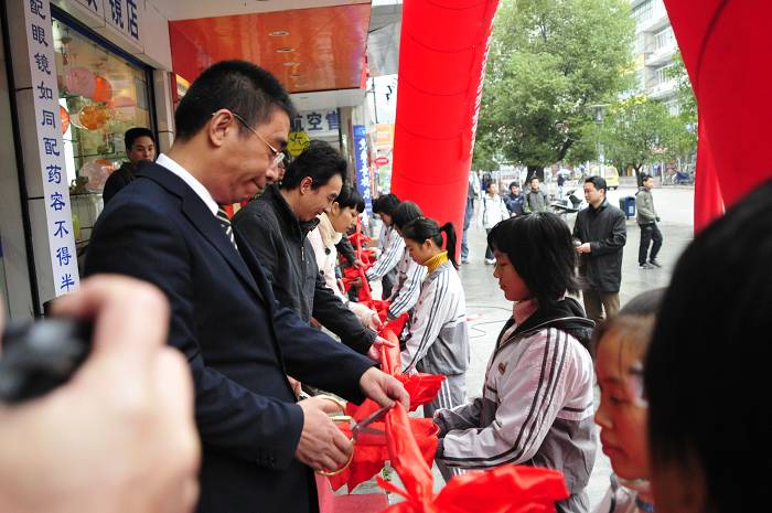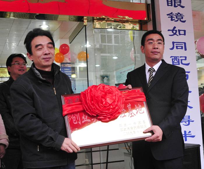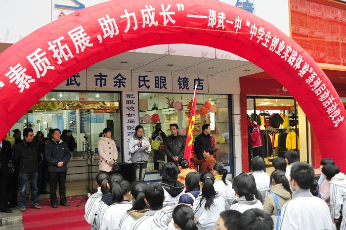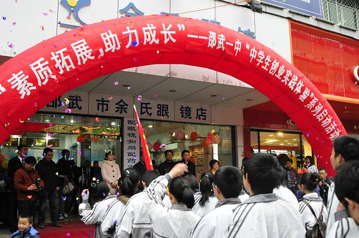 21日下午,邵武余氏眼镜店外,刷有标语火红的大型充气拱门高高矗立,音响不断播放着中国共青团团歌“光荣啊,中国共青团”,70名邵武一中团员扛着鲜红的团旗,穿校服,佩戴团徽、校徽,精神抖擞,笑逐颜开。仪式上,当一中副校长杨方将一块“邵武一中团委创业实践基地”的牌匾交到邵武余氏眼镜店经理手中时,标志着邵武一中团委“中学生创业实践体验”系列活动正式启动。参加仪式的还有共青团邵武市委副书记范晓蓉,市教育局德育科科长叶菁桦。