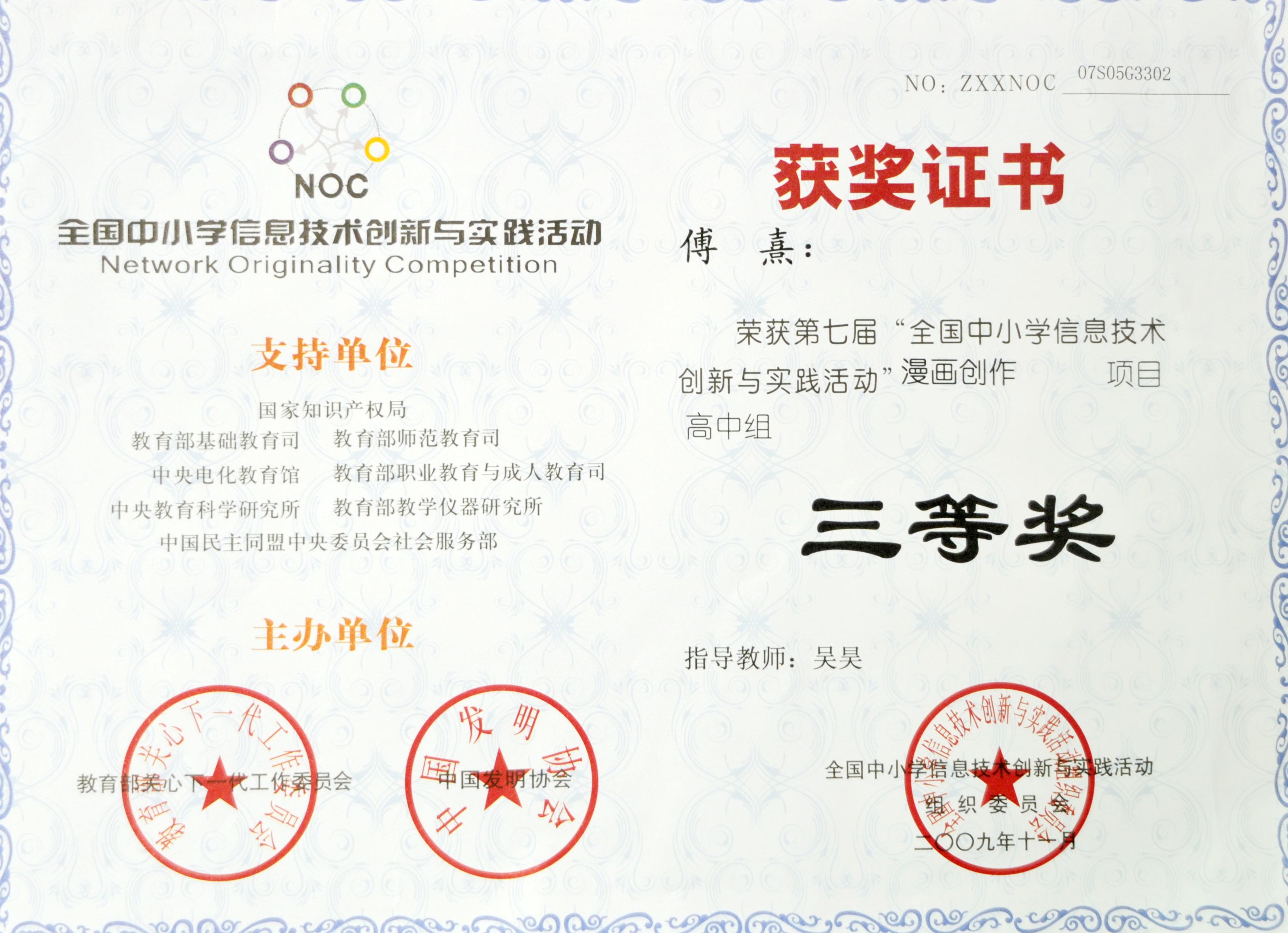 刚刚从全国中小学信息技术创新与实践活动组委会传来喜讯,我校傅熹同学荣获“全国中小学信息技术创新与实践活动”漫画项目高中组三等奖,这是我校迄今为止在漫画项目获得的最高荣誉。
