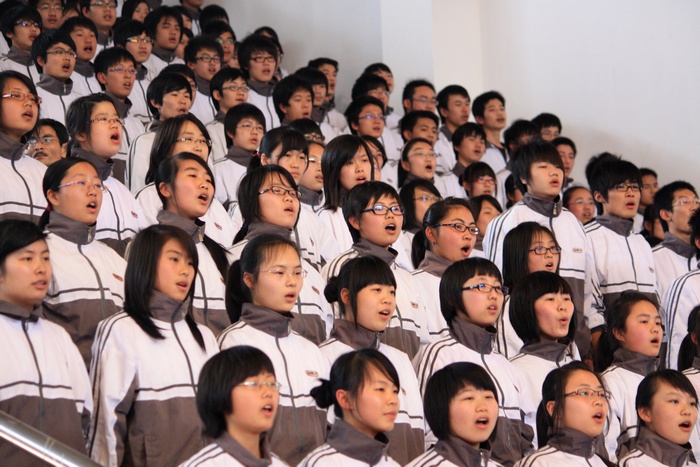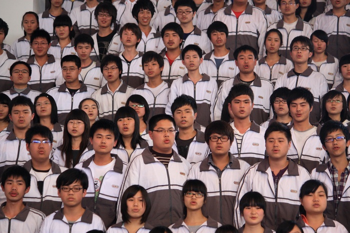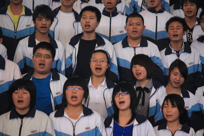 接下来是合唱比赛。各年段师生用激昂嘹亮的歌声抒发了对祖国的赞美。
