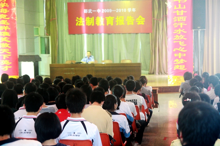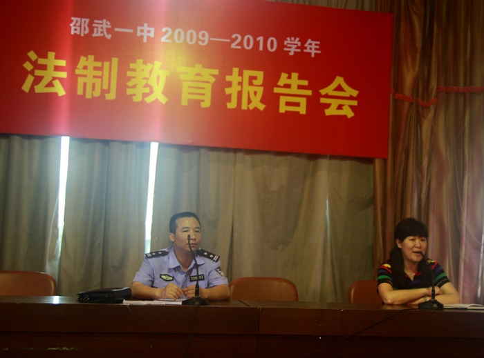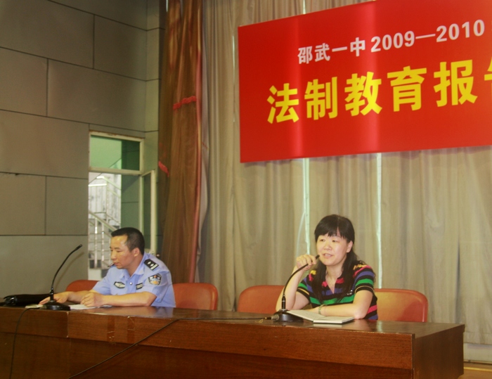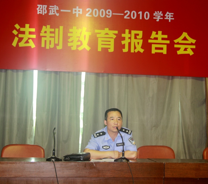 邵武一中法制教育报告会为了落实省教育厅《关于进一步加强中小学法制教育工作的通知》和中共中央宣传部、教育部、司法部、全国普法办联合制定的《中小学法制教育指导纲要》的精神要求,2010年5月17日下午,通泰派出所所长、邵武一中综治副校长陈忠同志为高一年段全体同学在现代教育中心学生报告厅举办了一场法制教育报告,加强了学生普法意识。