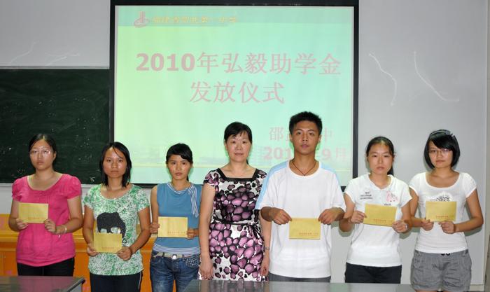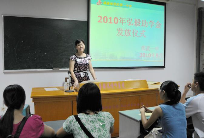 校园新闻 邵武一中举行2010年度弘毅助学金发放仪式 作者:admin 来源:本站原创 日期:2010-09-03 人气:3547 邵武一中举行2010年度弘毅助学金发放仪式 9月3日,邵武一中在校多媒体教室举行2010年度弘毅助学金发放仪式。政教处、团委及受助学生出席了发放仪式。仪式上,一中2010年高考文科第一名考取武汉大学的黄志颖等6名困难家庭大学生喜获总额为18000元的爱心资助。弘毅基金资助对象为邵武一中的在校贫困生以及应届贫困大学生,基金自2007年成立以来资助金额已累计达173600元。 上一篇:畅谈梦想,拥抱未来----邵武一中组织师生以《开学第一课》为契机 下一篇:市妇联发动社会爱心人士关爱资助贫困女学生 通知公告 更多 【瑞榴 • 公告】2026年福建省邵武... 【瑞榴 • 公告】2026年福建省邵武... 【瑞榴 • 公告】2026年邵武一中第... 【瑞榴 • 公告】2026年邵武一中自... 【瑞榴 • 公告】2026年福建省邵武... 【瑞榴 • 公告】2026年福建省邵武... 最新动态 更多 【瑞榴 • 德育】以赛砺师 匠心育... 【瑞榴 • 安全】2026总体国家安全... 【瑞榴 • 安全】联合调研促规范 ... 【瑞榴 • 主题教育】志愿学雷锋,... 【瑞榴 • 社团活动】传承非遗文脉... 【瑞榴 • 优秀校友】情系母校 反... 【瑞榴 • 教研】校际交流促成长 ... 【瑞榴 • 思政课】缅怀先烈志 传... 【瑞榴 • 安全】筑牢安全防线,... 【瑞榴 • 团建】铭记千秋功勋,...