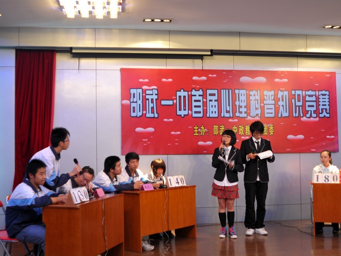 为普及中学生心理健康知识,弘扬心理文化,完善自我成长、悦纳自我心身,提高自信心,塑造健康人格,增强团队协作能力,26日下午,邵武一中政教处、团委成功举办校园首届心理科普知识竞赛。此次竞赛共设有问必答、快速抢答、勇者居上(风险题)、跃跃欲试(观众答题)等四个环节。来自高二年段的12名选手们分四组参加了竞赛,比赛过程中,不仅有各支代表队的精彩表现,更有主持人巧妙穿插的互动抢答游戏,在紧张又不失活跃的气氛中,同学们对心理健康知识的认知得到了新的提高,也进一步增强了心理健康意识,营造了积极健康的校园氛围。