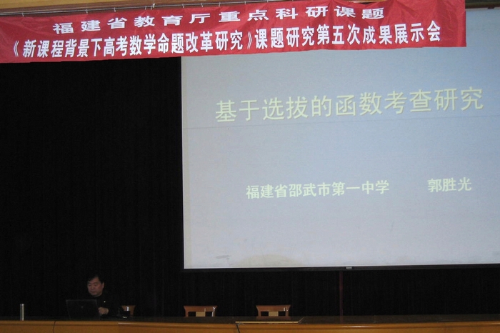 日前,郭胜光、吴志坚两位老师代表邵武一中参加由福建省高考命题研究中心举办的福建省教育厅重点科研课题《新课程背景下高考数学命题改革研究》课题研究第五次成果展示会议,全省高校、教研、中学等部门的三百多位教授、专家、学者和教师参加了会议。会上郭胜光老师以“基于选拔的函数考查研究”为题在展示会上作了专家报告,与会代表一致认为郭老师的报告既有理论高度又有实践经验,更难能可贵的是他把人们印象中冰冷严谨的数学演变的既妙趣横生又不乏深入的思考。会上总课题组还认为一中数学课题组关于《高考数学主干知识考查研究》水平居全省一流。