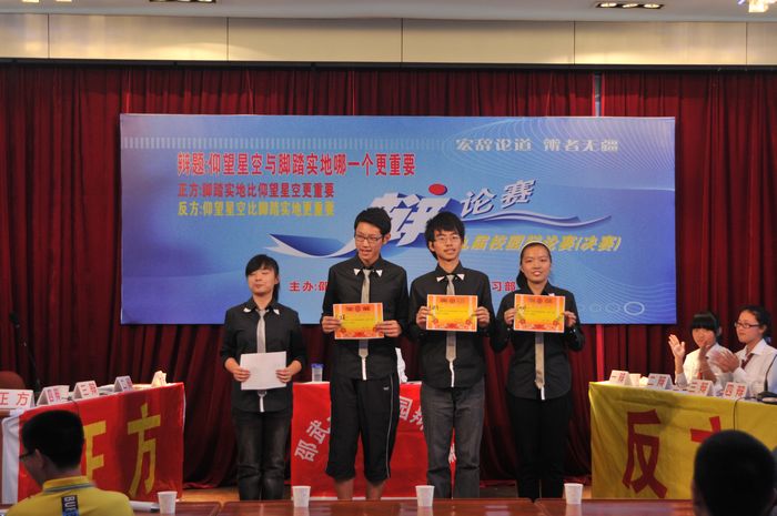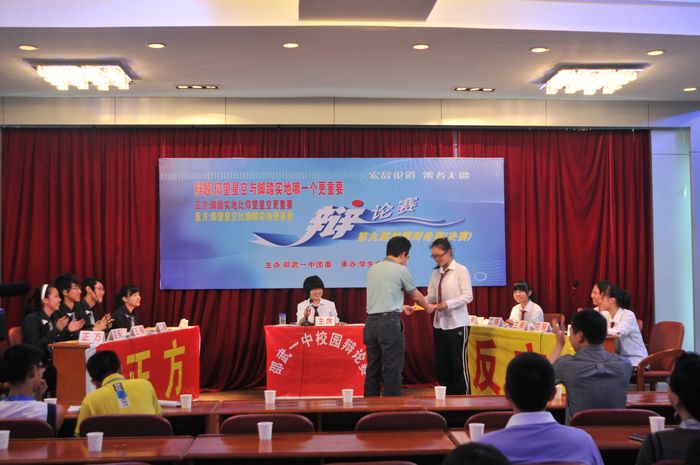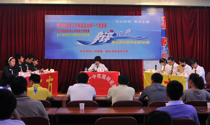 22日,邵武一中第九届校园辩论赛决赛现场座无虚席、气氛热烈,历时二个多月的以“纪念建党九十周年”为主题的第九届校园辩论赛圆满落幕。正反两方围绕“仰望星空和脚踏实地哪一个更重要”为辩题展开激烈的辩论,双方辩手针锋相对,唇枪舌剑,你来我往,以智慧和口才展示了他们的青春与活力。