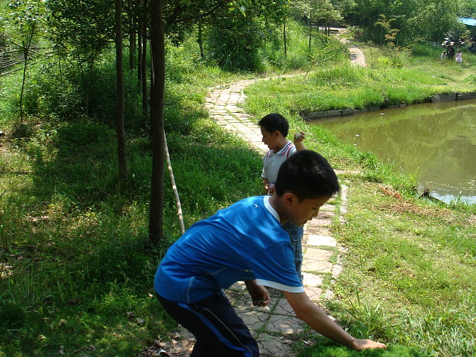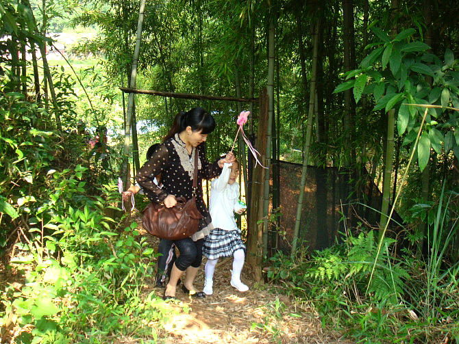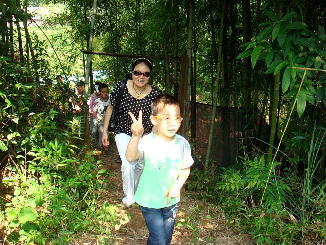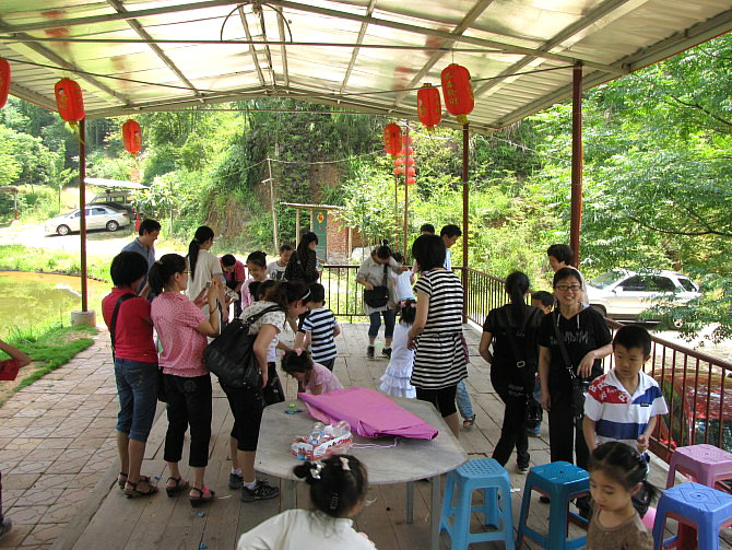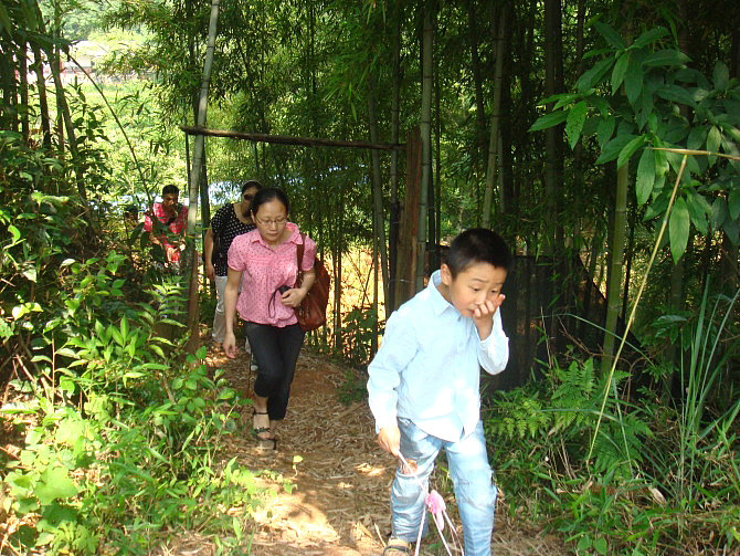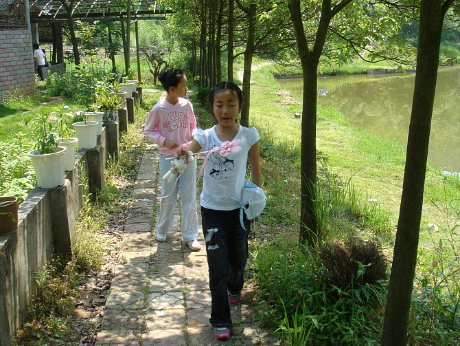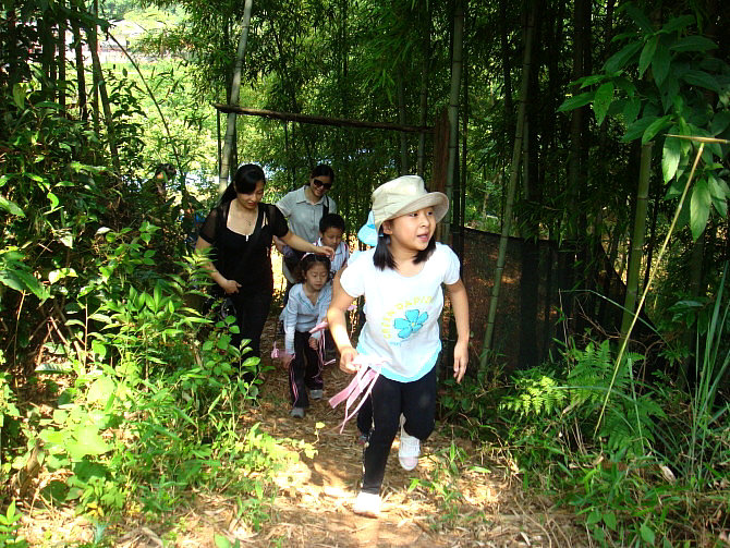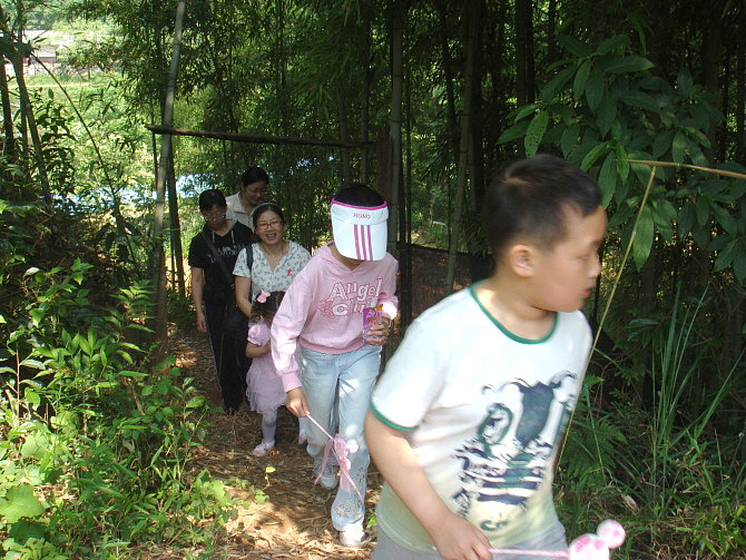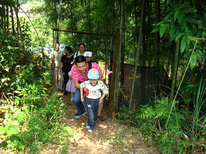 车一出城就可感觉到郊外湿润清新的空气,也就十几分钟的车程,我们就到达了。山庄是农家乐山庄,环境幽雅清静,充满野趣:长长的竹木走廊,隔开了左右两边各一个大大的池塘,鲤鱼嬉戏,白鲢欢跳;四周青山环抱,清新的空气沁人心脾。居然还有好多比我们更早到达的团队呢,他们坐在这绿荫环绕的庭院内品茗香茶、打牌、看书、聊天,个个都甚是惬意。