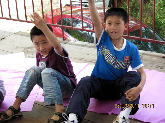 唱实小校歌,呵呵,幼儿园的小朋友虽然不会,但也很认真哦!