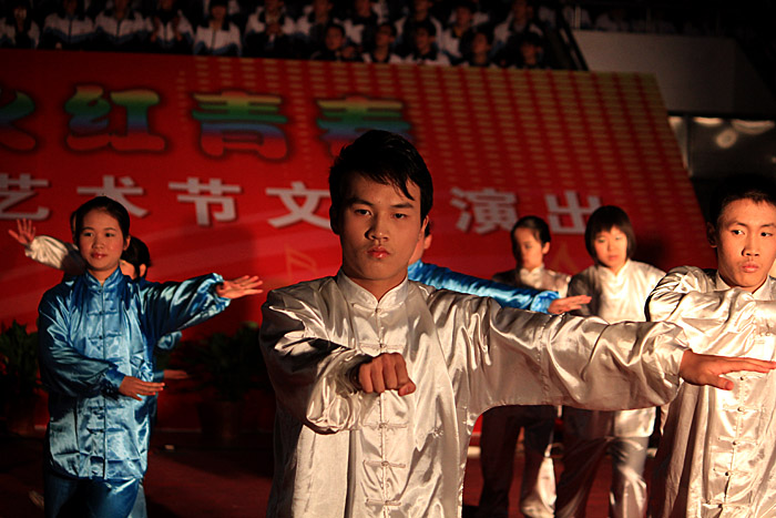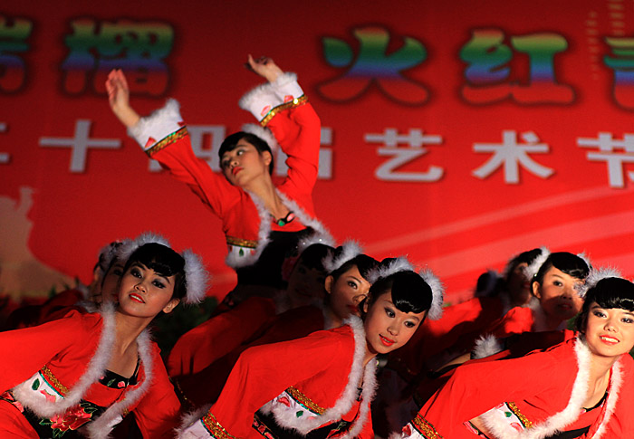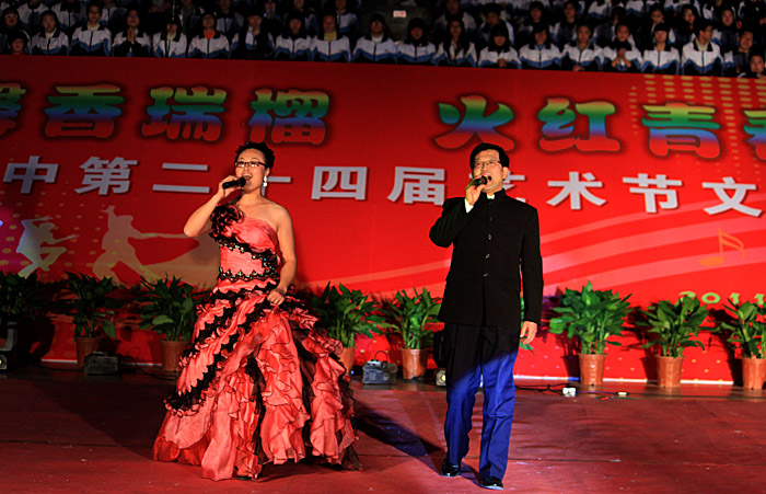 汇演首先由高一年段学生表演的鼓舞《腾飞中国》拉开序幕,紧接其后的歌伴舞,太极剑,配乐诗朗诵,教师红歌大联唱歌等节目一次次地把演出推向了高潮,演员们共同为全校师生奉献了一场视听盛宴。整个文艺演出历时二个多小时,最后演出在全校师生《歌唱祖国》大合唱声中圆满结束。