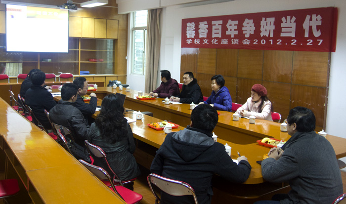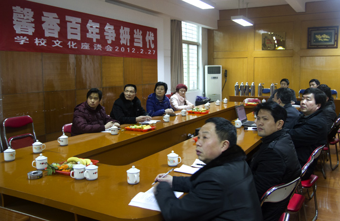 27日下午,“馨香百年,争妍当代”学校文化座谈会在邵武一中行政会议室举行。市委宣传部副部长吴长春在市教育局督导室副主任夏爱英等的陪同下与一中一、二层领导进行了座谈。座谈会上,范纯善校长作了关于邵武一中校园文化建设构架工作汇报。报告用幻灯片的形式全面展示了一中校园文化的核心价值观“一脉相承,一心追求,一意不怠,一生祥福”以及由此延伸出的校园制度文化、课程文化、师生文化、物质文化。吴长春副部长在听取报告后,首先对学校在校园文化建设上的成果给予了高度的评价,同时他希望一中在校园文化识别系统的开发以及学校文化手册的编订上有所突破。参与座谈的各位领导纷纷就校园文化建设工作的具体措施提出了积极可行的各种方案,讨论气氛热烈而融洽。本次校园文化座谈会,很好地对外推介了一中校园文化亮点,对于进一步加强一中校园文化建设起到了重要的推动作用。