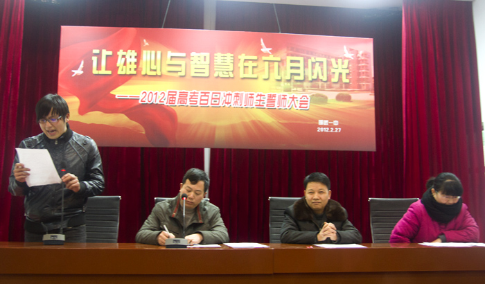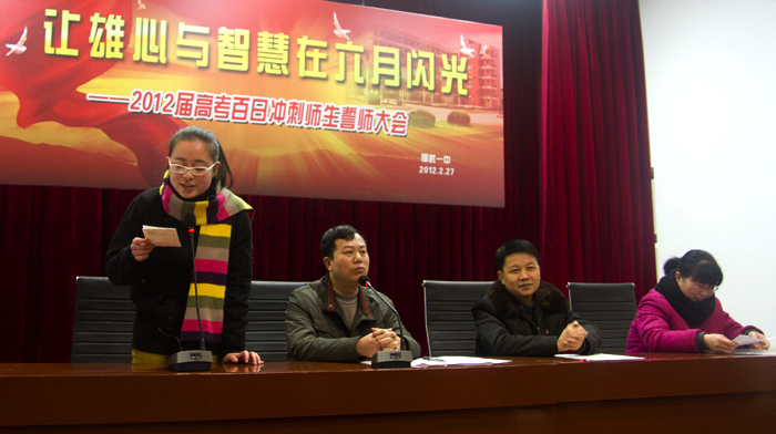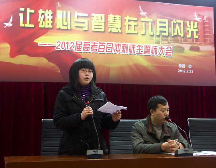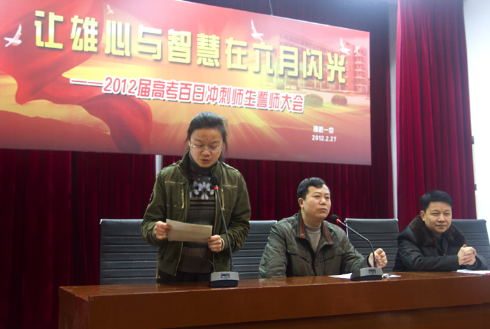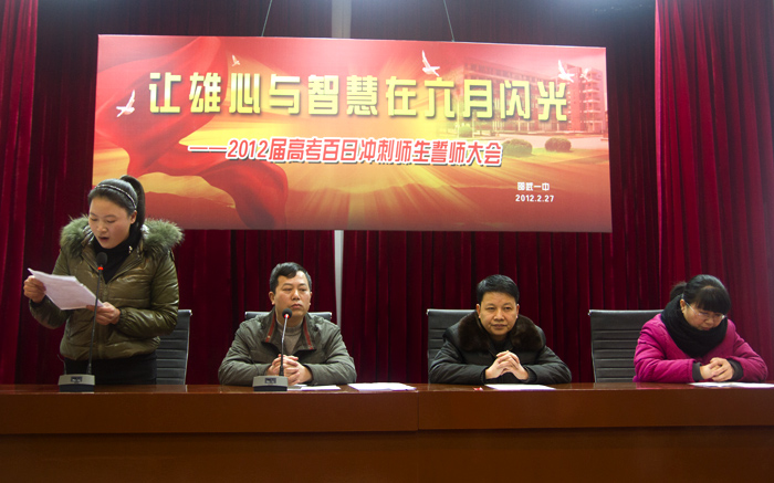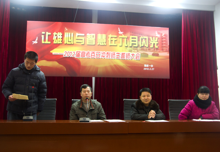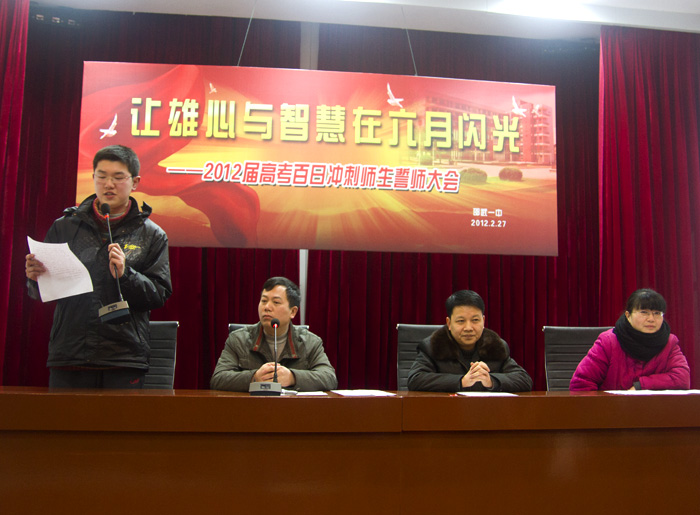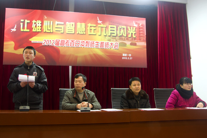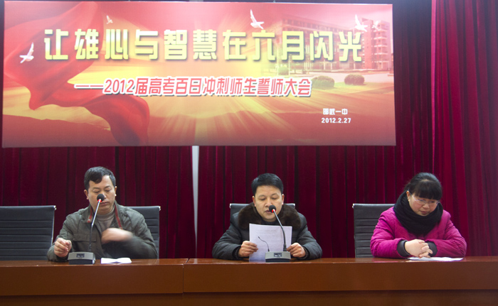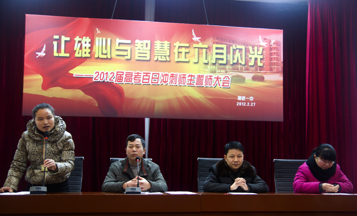 当日,首先由分管领导宋建民副校长作了热情洋溢的讲话,激励即将走向高考的学子发扬敢拼敢赢的精神,严格要求自己,按照年段总体要求和计划,讲求复习质量,提高复习效率,争分夺秒,稳扎稳打,不负众望,务求全胜。接着十五个班级的学生代表纷纷上台发言,激情飞扬,句句话语催人奋进;而后由两位老师分别代表班主任和科任老师发言,表达了高三全体教师对学生的殷切希望,同时给莘莘学子提出百日冲刺的学习方法和生活提示。最后,全体师生齐读《2012届高三百天誓师大会誓词》。整个会场互动热烈,学生热情高涨,展现了邵武一中高三学子饱满的精神状态和对高考必胜的信心。