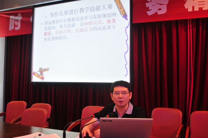 讲座上,饶干东副校长从刚举办完的全国首届教学技能大赛入手,结合教学实际及具体的案例,谈了为什么要进行教学技能大赛,教学技能大赛赛什么?教学技能的基本类型,首届教学技能的基本项目。最后他提出四点启示:所谓业务精湛就是教师具有精深的专业知识,高超的专业技能及崇高的敬业精神;二要加强理论学习:教育教学理论的学习,认真研读课程标准(理念、三维目标和要求);三要加强教育教学科研,提高综合素质;四要提升教学基本技能:教学设计、片段教学、教学组织、演讲、教育技术应用等。