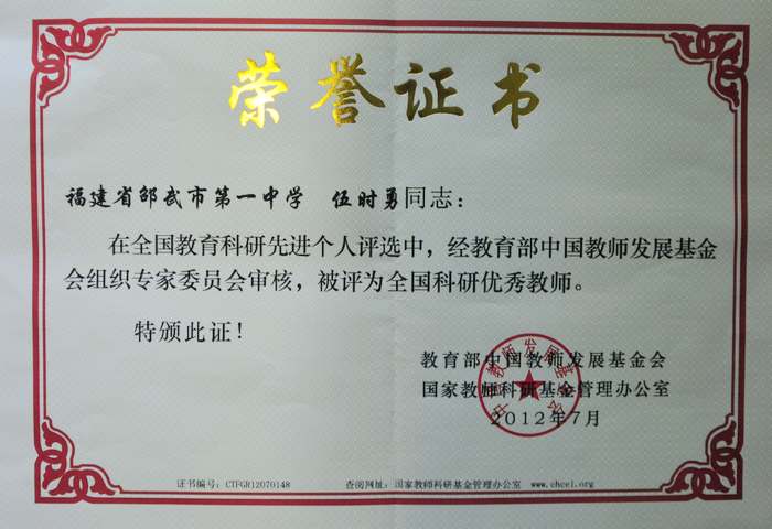 近日,从中国教师发展基金会传来喜讯,邵武一中教师伍时勇、魏冬英、万琳燕荣获2012年度“十二五”全国科研优秀教师。在“学习途径与方法、习惯对学力发展与研究”课题研究中,学校课题组充分发挥名师、骨干教师的带头作用,以专题讲座、校本研修等为载体,积极搭建教师专业成长的平台,对学校教育教学质量的提升产生极大的推动作用。
