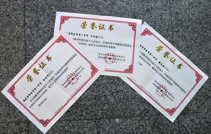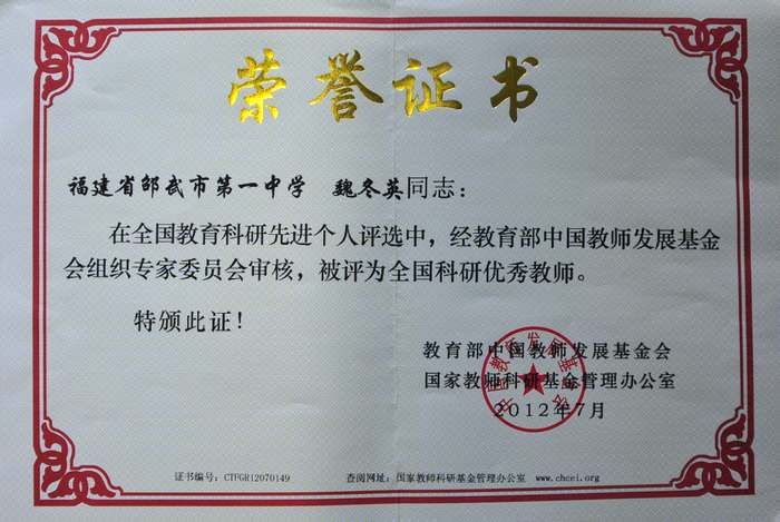一中三位教师荣获2012年度全国科研优秀教师称号