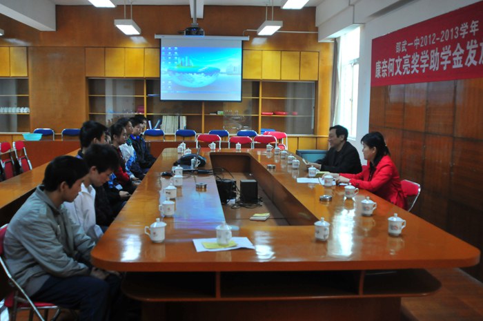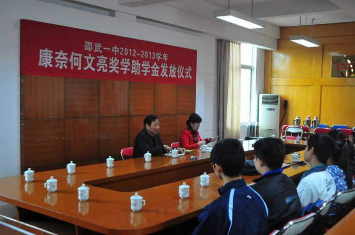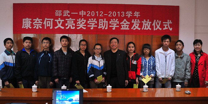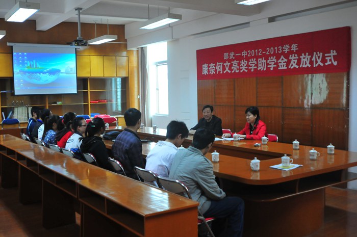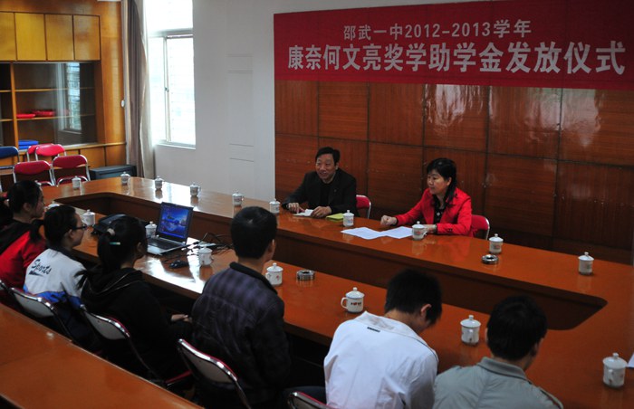 7日上午,邵武一中在校行政会议室举行“康奈皮鞋何文亮2012-2013学年奖学助学金”发放仪式。本奖学助学金由康奈皮鞋何文亮先生于2010年创办,资助对象为邵武一中品学兼优的十名贫困高中生,目前奖学助学金总额已达三万元。