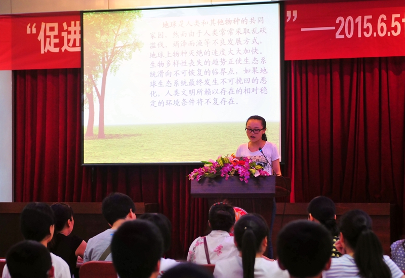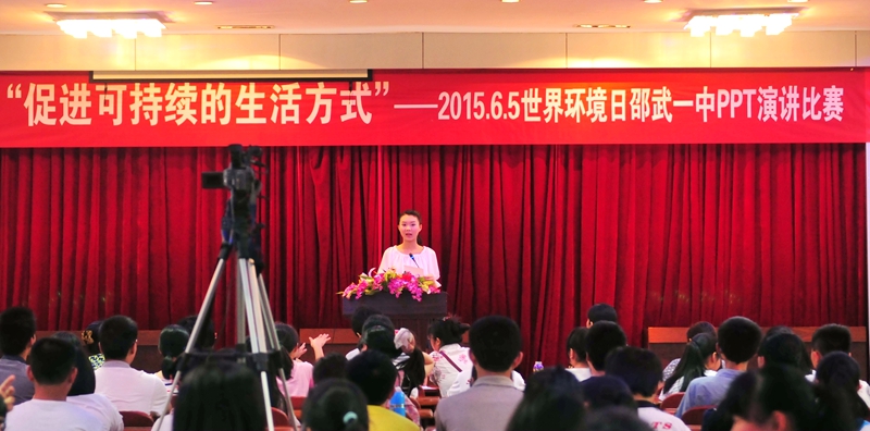为增强学生的环保意识,邵武一中于6月4日在教工会议室举行了以“促进可持续发展”为主题的PPT演讲比赛。比赛中,选手们紧扣主题,慷慨陈词,或幽默风趣、或鞭辟入里,激动处声情并茂,赢得了阵阵掌声。虽然演讲风格各有不同,但选手们都以饱满的激情发出了同一个声音:关注生态环境、共建地球家园!