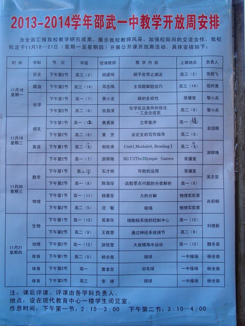 校园新闻 邵武一中开展2013-2014学年教学开放周活动 作者:admin 来源:本站原创 日期:2013-11-20 人气:2444 11月18日至21日,邵武一中面向全市高中学校开展教学开放周活动,10个学科18位中青年教师一展教学风采。活动中,各学科教研组精选授课教师,力求结合新课改,做到示范性、新颖性。参与听课及评课的教学同仁都对本次活动作出了很高的评价。这次教学开放周活动达到了促进教师的专业成长,搭建兄弟学校之间交流平台的目的。 上一篇:一中图书馆顺利通过“省级中小学示范图书馆”复查 下一篇:我校举办节日、安全、法制小报展 通知公告 更多 【瑞榴 • 公告】2026年福建省邵武... 【瑞榴 • 公告】2026年福建省邵武... 【瑞榴 • 公告】2026年邵武一中第... 【瑞榴 • 公告】2026年邵武一中自... 【瑞榴 • 公告】2026年福建省邵武... 【瑞榴 • 公告】2026年福建省邵武... 最新动态 更多 【瑞榴 • 德育】以赛砺师 匠心育... 【瑞榴 • 安全】2026总体国家安全... 【瑞榴 • 安全】联合调研促规范 ... 【瑞榴 • 主题教育】志愿学雷锋,... 【瑞榴 • 社团活动】传承非遗文脉... 【瑞榴 • 优秀校友】情系母校 反... 【瑞榴 • 教研】校际交流促成长 ... 【瑞榴 • 思政课】缅怀先烈志 传... 【瑞榴 • 安全】筑牢安全防线,... 【瑞榴 • 团建】铭记千秋功勋,...