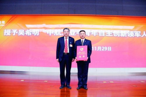中国航空报讯:11月29日,中航工业在北京举行表彰仪式,授予吴希明“中航工业中青年自主创新领军人才”荣誉称号,并重奖150万元。中航工业董事长林左鸣出席仪式,中航工业副总经理高建设主持仪式并宣读表彰决定。