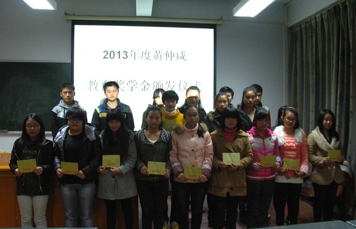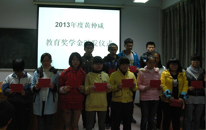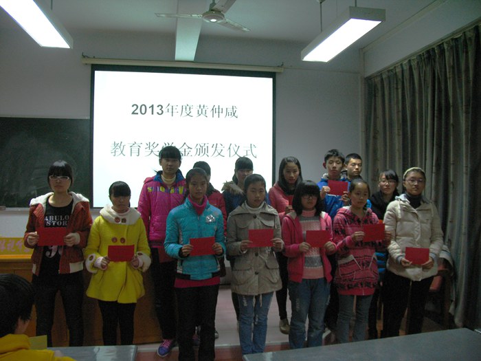 9日下午,一中团委在校多媒体教室举行2013年度黄仲咸教育基金会助学金发放仪式。发放仪式上,全校共有50位家庭困难、品学兼优的在校高中生获得了黄仲咸基金会助学金。市老区办一行二人为学生发放了总金额达38500元人民币的黄仲咸教育基金会助学金。