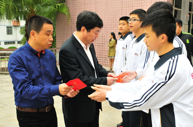 23日上午升旗仪式上,一中校长郭胜光,书记张光华为谢皓政、张林元齐、赵鸿伟、邹玮琦这四位同学颁发了2015年度邵武一中“邓稼先”物理奖证书及奖金。