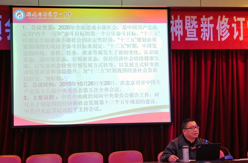 25日晚,一中党委在校教工会议室举办“学习领会十八届五中全会精神暨新修订党纪准则、条例”辅导讲座。讲座由一中党委张光华书记主持,全校100多名党员参加了讲座。
