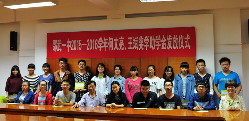 10月28日下午,邵武一中于校行政会议室举行2015-2016学年何文亮、王斌奖学助学金发放仪式。仪式上,受何文亮与王斌先生委托来到一中的何先生,为20位优秀的同学发放了奖助学金各1500元。最后,政教处陈丹主任向受到资助的同学表示祝贺,她希望同学们牢记这份情谊,不辜负资助者及广大师生的殷切期望,发奋学习,执着追求,努力成为对社会、对国家都有益的优秀人才,以出色的成绩回馈这份情谊、回报社会。