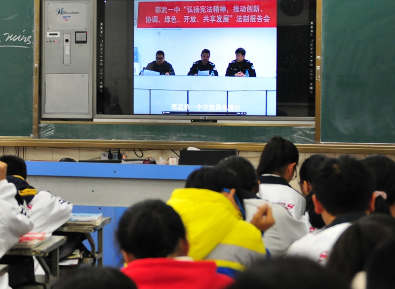 为迎接即将到来的国家宪法日暨全国法制宣传日,邵武一中于30日下午通过校园网络电视系统,以电视直播的方式向全校师生实时召开了一场主题为“弘扬宪法精神,推动创新、协调、绿色、开放、共享发展”的法制报告会。本次报告由一中纪委书记周国华主持,邀请了校综治副校长朱警官主讲。朱警官通过几个生动的实际案例,深入浅出地向同学们普及法律知识,并号召同学们学法、懂法、守法,做一个合格社会主义接班人。