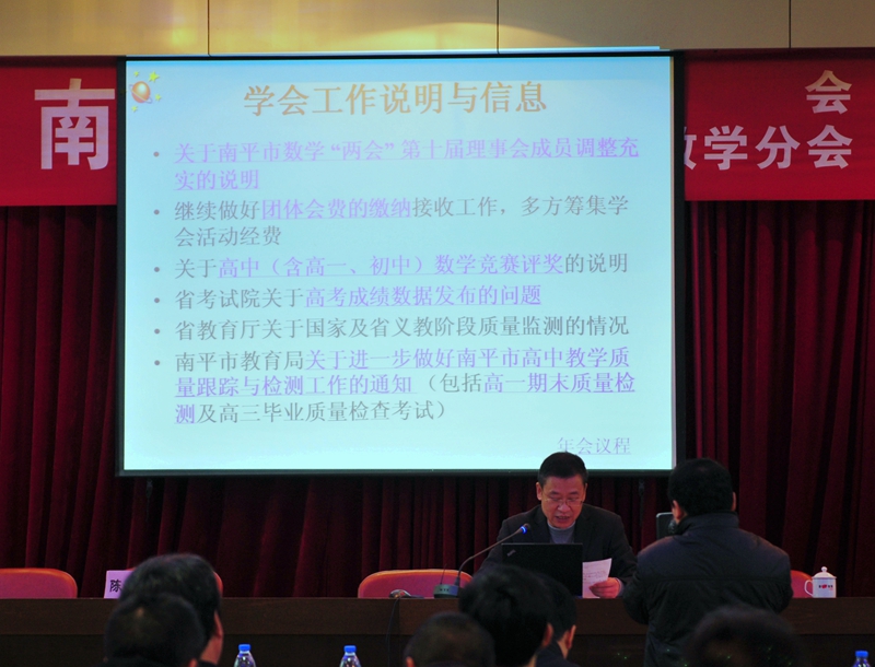 本次年会的主题是中学数学课程改革与教学研讨,与会代表听取了南平市数学“两会”工作报告,刘用鳞理事长对学会工作的开展情况作了简单的说明和总结,并指出了工作中的不足之处以及今后的努力方向。