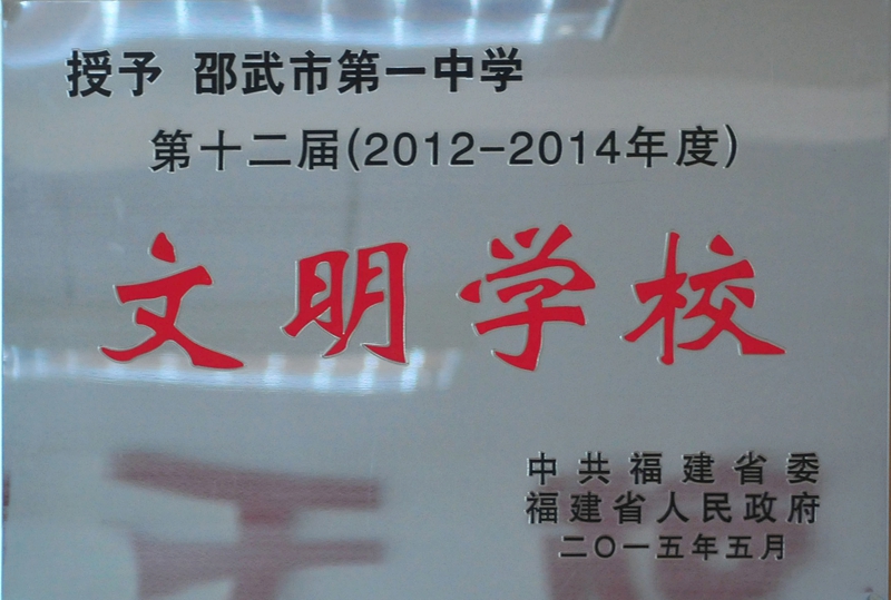 日前,中共福建省委、福建省人民政府授予邵武一中“第12届文明学校”光荣称号。近年来,在各级党委、政府的关心支持和教育主管部门的正确领导下,学校秉承“为每一位学生的可持续发展奠基”的办学理念,坚持德育为首、教学为主、不断优化育人环境,注重师德师风建设,积极开展精神文明创建活动,提高教育质量,提升办学声誉,创新思路,强化措施,坚持标准,保证质量,取得了丰硕的办学成果。