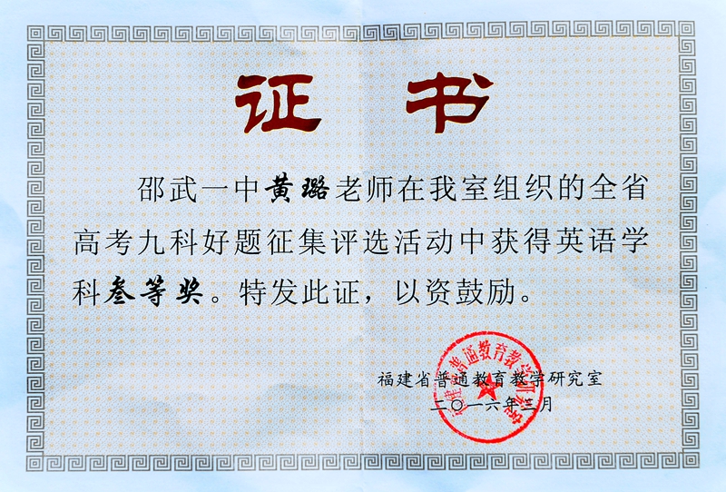 校园新闻 我校教师在省普教室组织的高考九科好题征集评选活动中荣获三等奖 作者:admin 来源:本站原创 日期:2016-05-27 人气:3014 上一篇:一中高三年段再次开展减压活动 下一篇:教务处召开“落实岗位责任,强化管理监督”工作会议 通知公告 更多 【瑞榴 • 公告】2026年福建省邵武... 【瑞榴 • 公告】2026年福建省邵武... 【瑞榴 • 公告】2026年邵武一中第... 【瑞榴 • 公告】2026年邵武一中自... 【瑞榴 • 公告】2026年福建省邵武... 【瑞榴 • 公告】2026年福建省邵武... 最新动态 更多 【瑞榴 • 德育】以赛砺师 匠心育... 【瑞榴 • 安全】2026总体国家安全... 【瑞榴 • 安全】联合调研促规范 ... 【瑞榴 • 主题教育】志愿学雷锋,... 【瑞榴 • 社团活动】传承非遗文脉... 【瑞榴 • 优秀校友】情系母校 反... 【瑞榴 • 教研】校际交流促成长 ... 【瑞榴 • 思政课】缅怀先烈志 传... 【瑞榴 • 安全】筑牢安全防线,... 【瑞榴 • 团建】铭记千秋功勋,...
