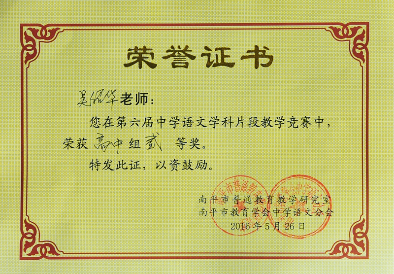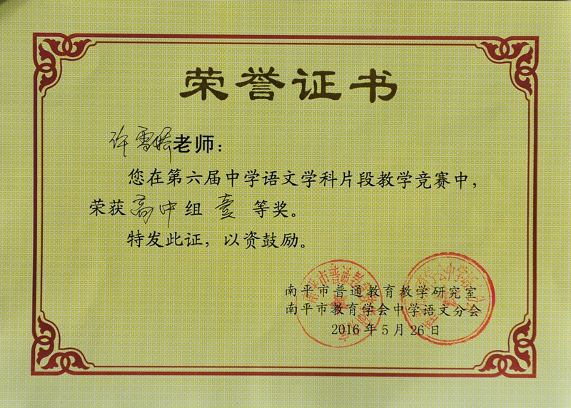 27日,从南平市普教室传来喜讯,邵武一中在“南平市第六届中学语文学科片段教学竞赛”中又取得佳绩,学校语文教师全帆,许雪娇获高中组一等奖;刘美英,吴绍华荣获二等奖。