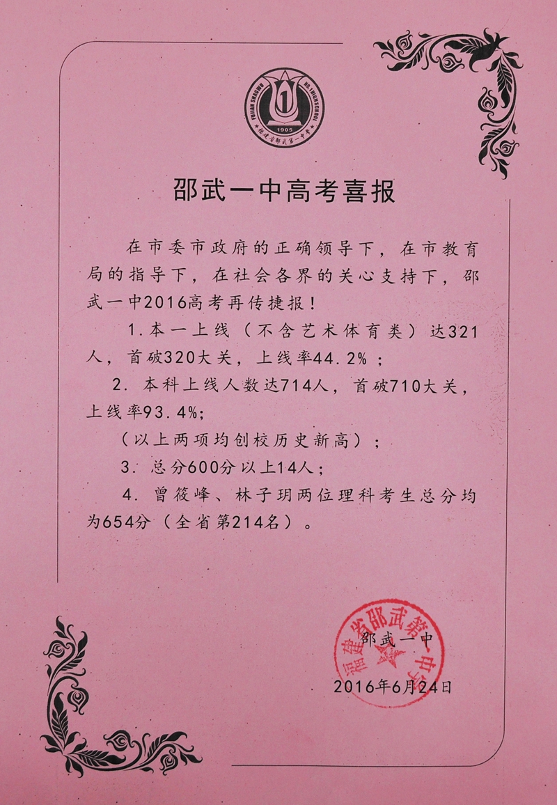 校园新闻 喜 报---邵武一中2016高考再传捷报 作者:admin 来源:本站原创 日期:2016-06-24 人气:4741 上一篇:一中举行高考志愿填报指导会 下一篇:三年磨一剑 再创辉煌--邵武一中2016届高考再创新高 通知公告 更多 【瑞榴 • 公告】2026年福建省邵武... 【瑞榴 • 公告】2026年福建省邵武... 【瑞榴 • 公告】2026年邵武一中第... 【瑞榴 • 公告】2026年邵武一中自... 【瑞榴 • 公告】2026年福建省邵武... 【瑞榴 • 公告】2026年福建省邵武... 最新动态 更多 【瑞榴 • 德育】以赛砺师 匠心育... 【瑞榴 • 安全】2026总体国家安全... 【瑞榴 • 安全】联合调研促规范 ... 【瑞榴 • 主题教育】志愿学雷锋,... 【瑞榴 • 社团活动】传承非遗文脉... 【瑞榴 • 优秀校友】情系母校 反... 【瑞榴 • 教研】校际交流促成长 ... 【瑞榴 • 思政课】缅怀先烈志 传... 【瑞榴 • 安全】筑牢安全防线,... 【瑞榴 • 团建】铭记千秋功勋,...