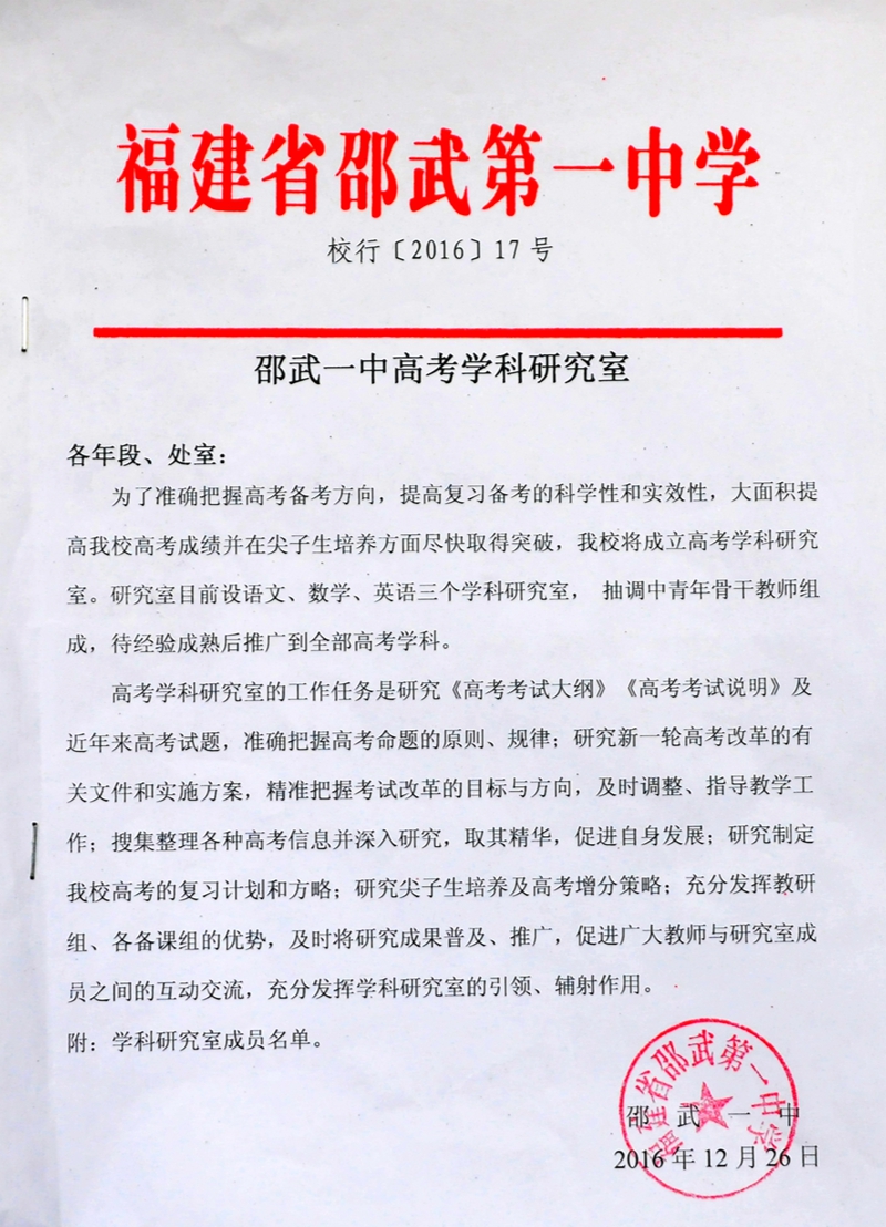 邵武一中成立高考学科研究室