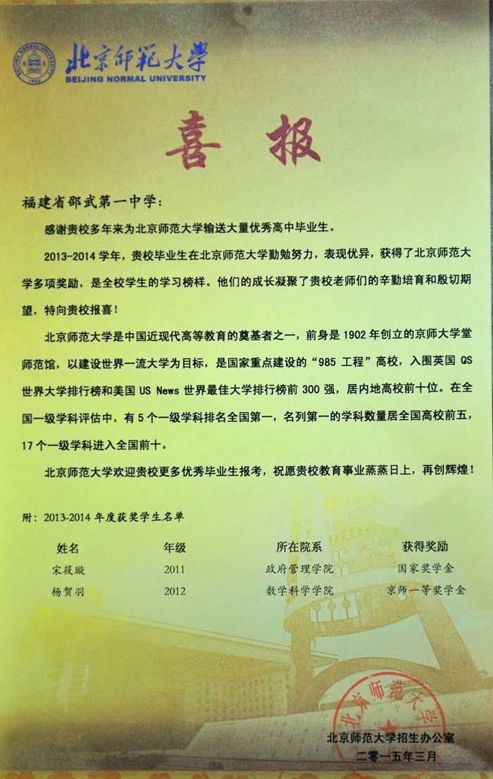 近日,从北京师范大学传来喜讯,一中2011届毕业生宋筱璇、2012届毕业生杨贺羽荣获北京师范大学2013-2014学年奖学金,其中宋筱璇荣获国家奖学金,杨贺羽荣获京师一等奖学金。北京师范大学是教育部直属重点大学,国家“985工程”高校,入围英国QS世界大学排行榜和美国US News世界最佳大学排行榜前300强。两位同学入学后勤勉努力,表现优异,荣获国家奖学金,为母校争得了荣誉,可喜可贺!