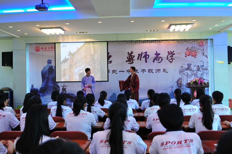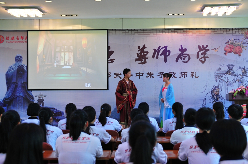 本次朱子敬师礼共四敬。一敬国,二敬校,三敬长,四敬师。敬师活动环节第一回:学生以情景剧的方式再现了朱熹受邵武好友何镐邀请,以交游讲学为名,到邵武试院观“瑞榴”,将学校的历史与朱子文化充分融合,以灵活的形式展现当地历史文化;第二回:学生迎朱子及众师,呈《敬师帖》,以示敬意;第三回:学生呈上朱子整理编修过的,以芹菜、莲子、桂圆、红枣、红豆、肉干六种食材寓意学习的“释菜六礼”,教师回赠《白鹿洞书院揭示》卡片,师生互赠,在体现良好的师生关系过程中,传承礼仪。随后学生行谢师礼,以示感谢与敬意;第四回:师生齐诵《白鹿洞书院揭示》,以示对朱子的怀念的追忆。