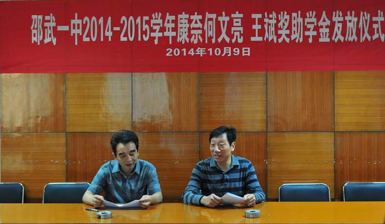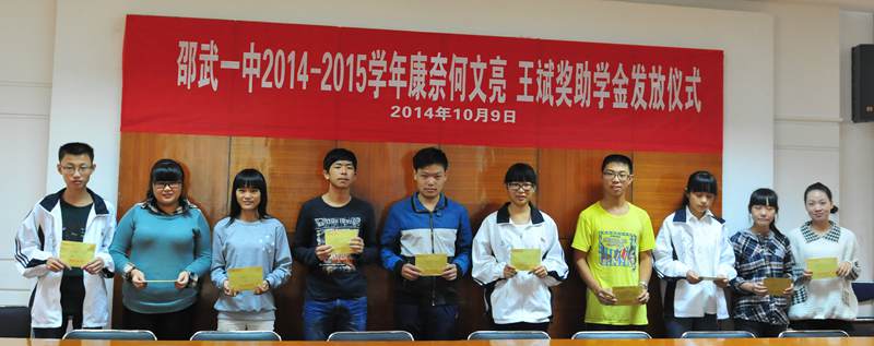 9日上午,邵武一中在校行政会议室举行“2014-2015学年康奈何文亮、王斌奖学助学金”发放仪式。本奖学助学金资助对象为邵武一中品学兼优的二十名贫困高中生,目前奖学助学金总额已达七万元。
