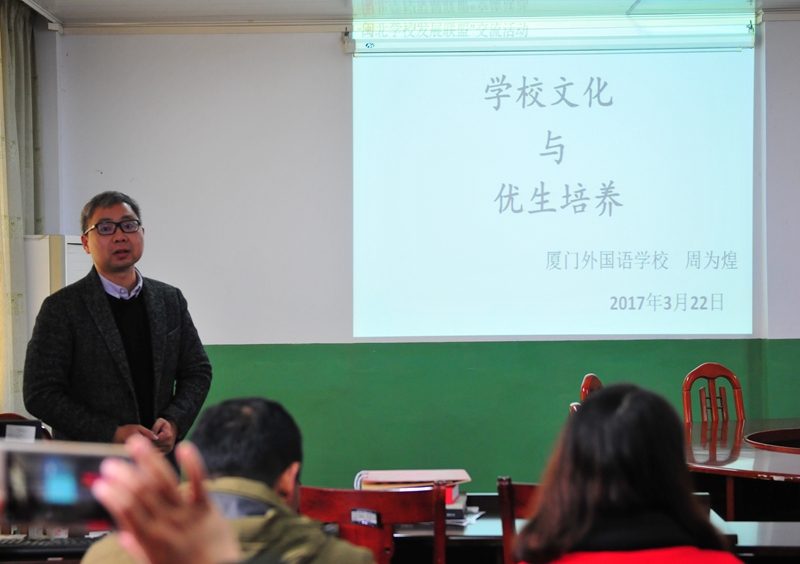 本次研讨会邀请了厦门外国语学校周为煌老师为全体与会代表作了“学校文化与优生培养”的主题分享。会上,周老师首先介绍了自主招生的时间、参加条件、笔试面试的考核方式及其他一些相关情况,接着从环境文化、课程文化、教学文化、社团文化、团队文化等几个方面介绍了厦外的学校文化建设情况,并就如何培养提升学生的核心素养这个问题,谈了许多富有建设性的观点和做法。