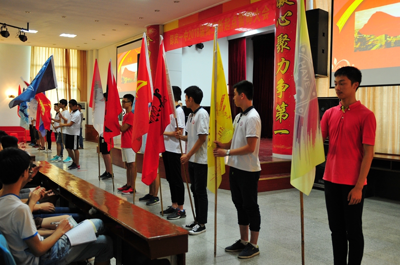在各班旗手迈开坚定的步伐走向主席台时,所有学生的心似乎都汇集在了一起,在这14面旗飘扬的当下,所有人听到了14个班在呐喊声中张扬的口号。少年自有少年狂,可以渺昆仑,可以笑吕梁。这就是邵武一中2018届高三学子坚定的呐喊!