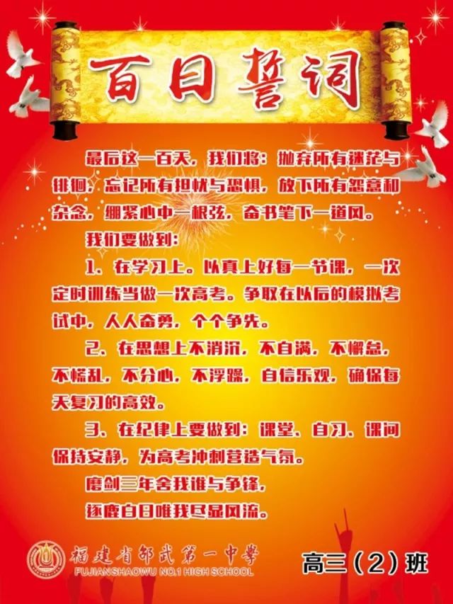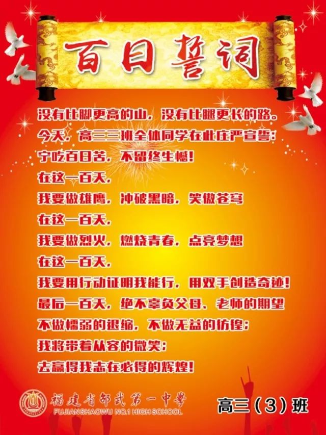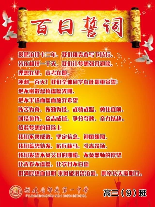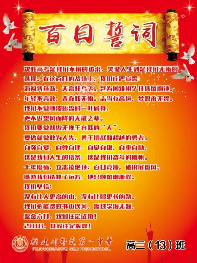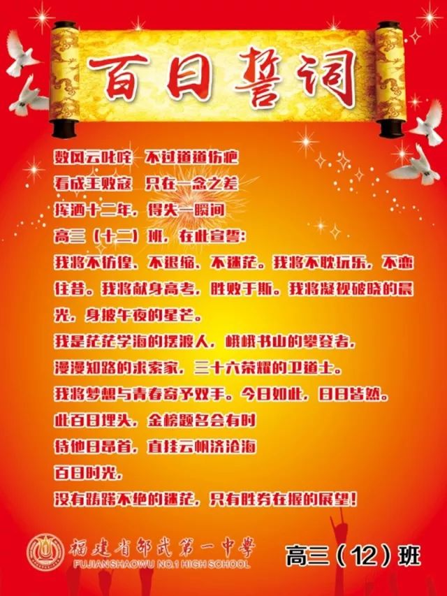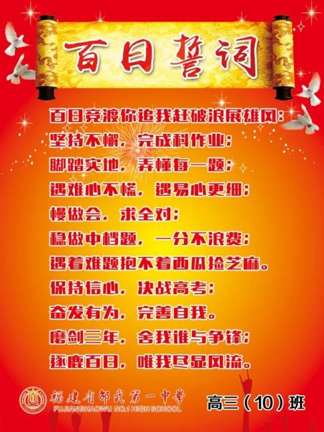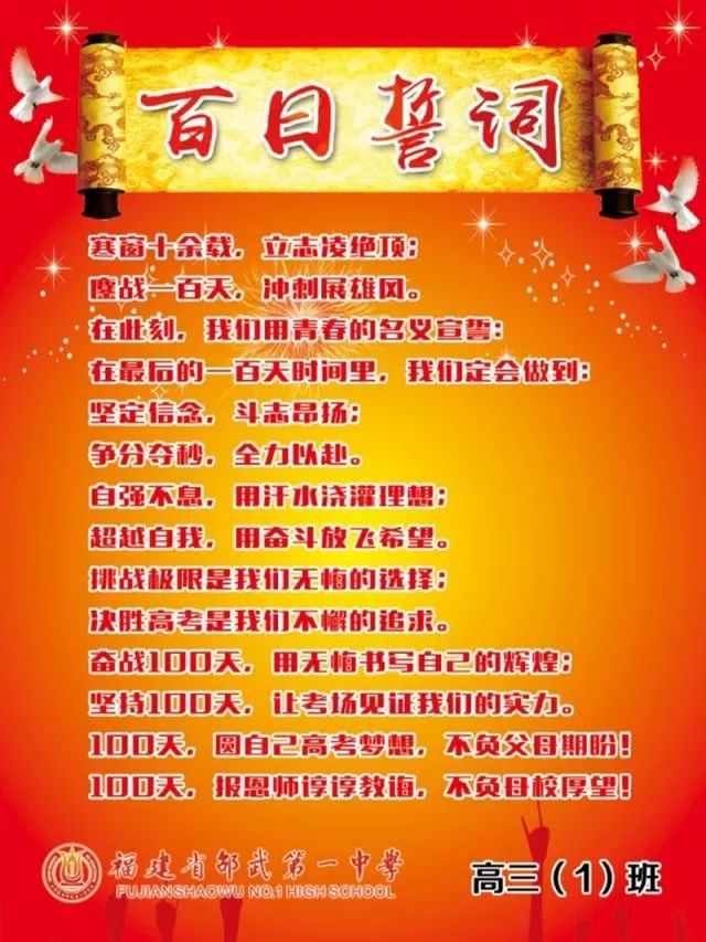 百日攻坚的战鼓已经擂响,邵武一中高三学子百日誓师激昂的口号,彰显了“百日鏖战,折桂蟾宫”的自信,抒发了“拳拳赤子心,誓不负韶华”的豪情,这是一中学子扬凌云壮志的进军号,亦是展必胜芳华的铿锵曲。