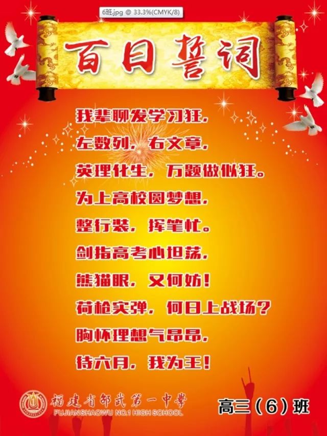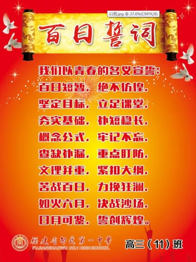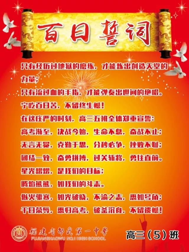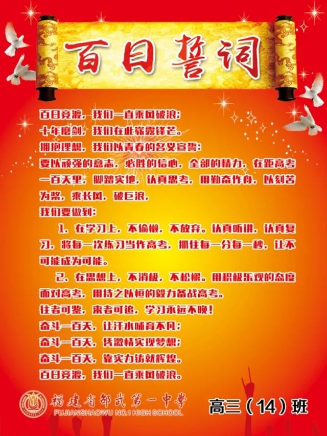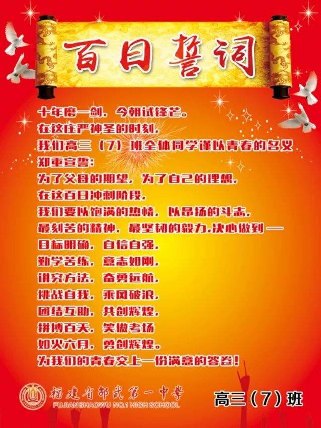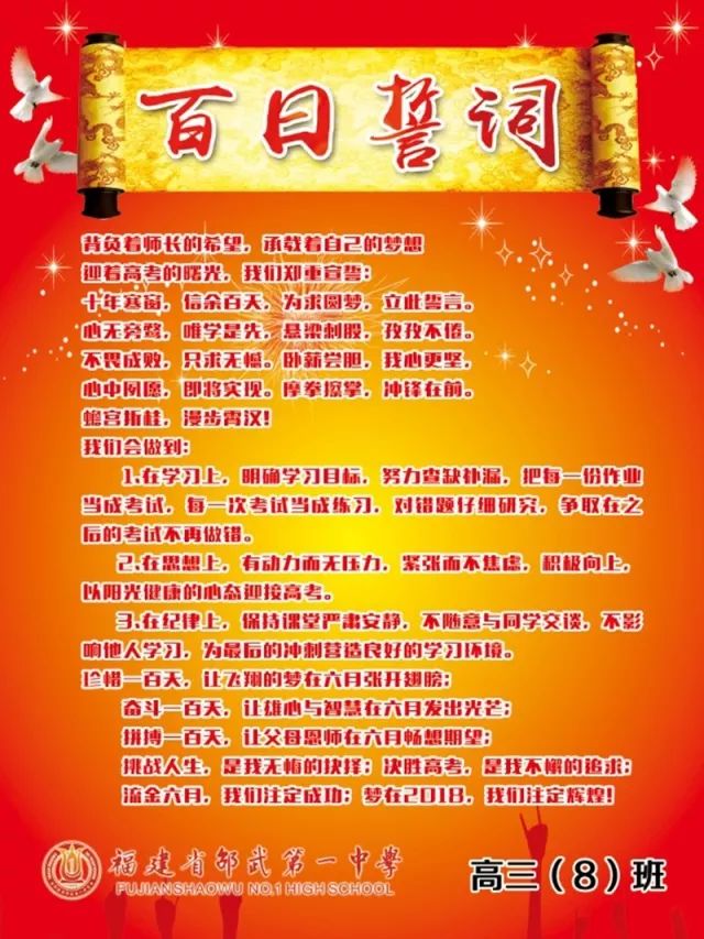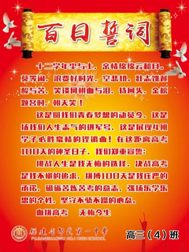 百日攻坚的战鼓已经擂响,邵武一中高三学子百日誓师激昂的口号,彰显了“百日鏖战,折桂蟾宫”的自信,抒发了“拳拳赤子心,誓不负韶华”的豪情,这是一中学子扬凌云壮志的进军号,亦是展必胜芳华的铿锵曲。