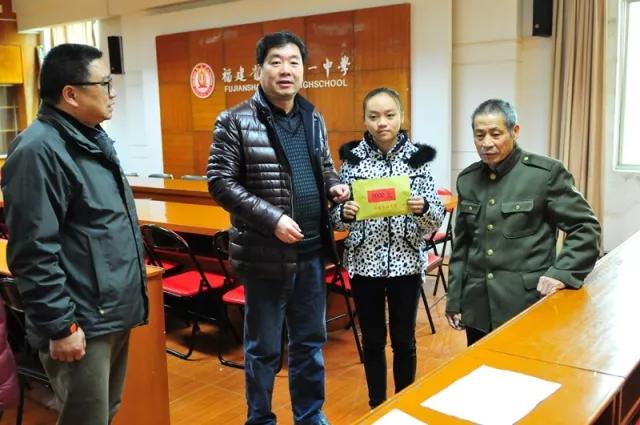 2017年12月13日课间操,在邵武一中二楼行政会议室,校长郭胜光、校党委副书记周国华代表邵武一中党委将学校筹集的5000元建档立卡贫困生专项帮扶金交到我校党组织建档立卡挂钩帮扶的一名高一学生手中,被帮扶学生年迈的爷爷也到了现场。该生与奶奶寄住城区亲戚家中,家庭经济十分困难,根据该学生具体情况,校党委、校行政研究决定2017年给予资金现金帮扶5000元,作为学生家庭生活资金帮扶。