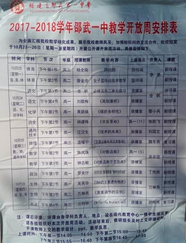 2017年11月23至26日,邵武一中举办教学开放周展示观摩活动,全市各中学一线教师代表及市进修学校教研员等137人次参加了本次教学开放周活动。这次活动历时一周,14名教师进行了精彩的课堂教学展示,各教研组相互合作进行主题教研活动,让社会各界了解我校,加强我校和全市各中学的联系,形成相互学习,相互促进良好氛围,在此基础上展示成果,培养骨干,规范教研,探讨教法,提高质量。